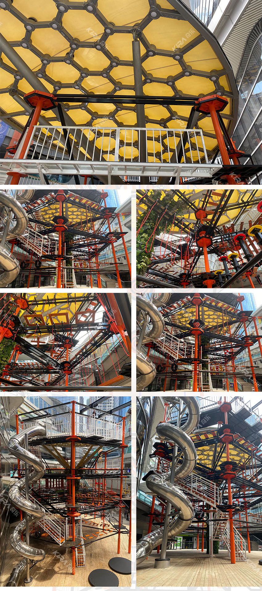 杭州桐廬縣生仙里竹溪探險塔是一個匯集戶外娛樂、攀巖、飛狐等項目于一身的立體娛樂綜合體,是創新性的景區標志性運動游樂項目綜合體,設備占地面積達到448㎡,綜合用地面積達600㎡,單層高達4.3m,內部以晶體結構搭建架空層2-4個步道層級,打造層超過650米長的空中游樂路線,其中包含91個運動項目(包括尖叫滑梯、矩形秋千、低空蹦極、戶外攀巖等4個),能滿足150個游客同時進行冒險,被譽為運動游樂之王。