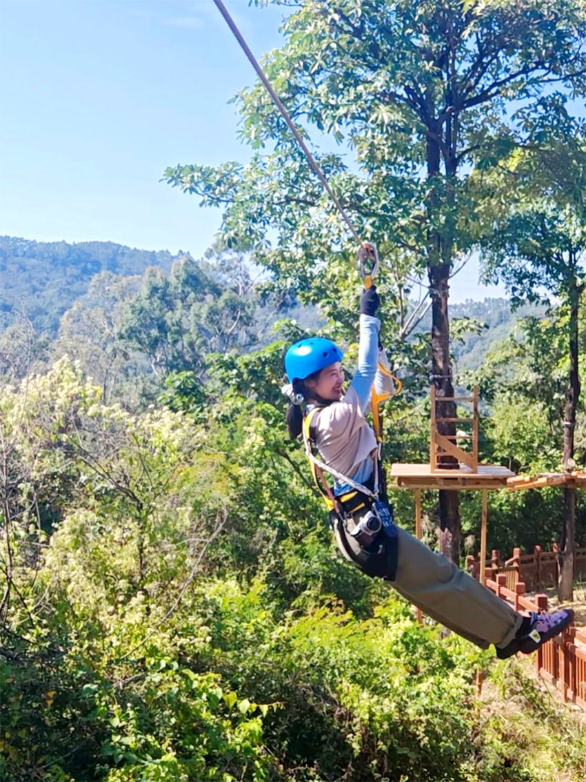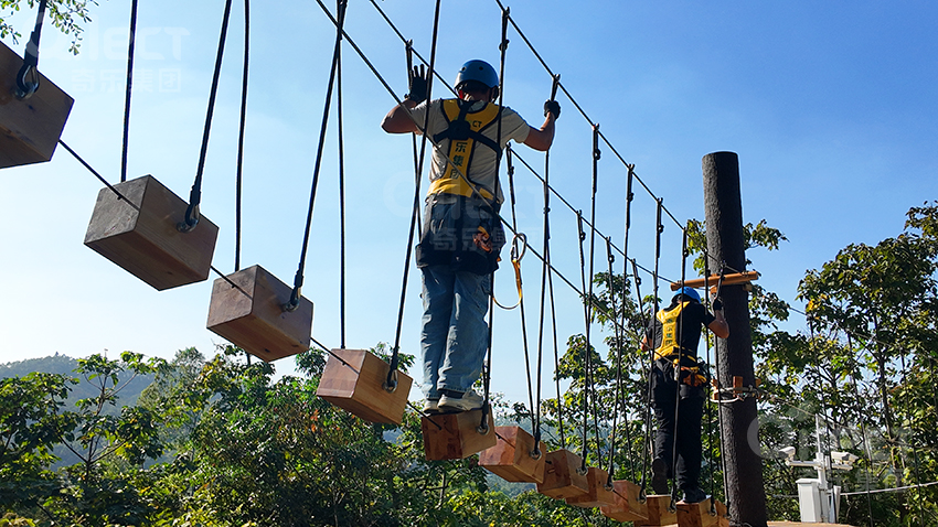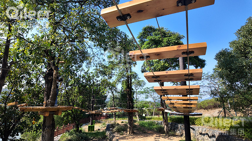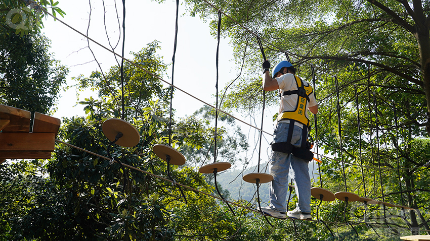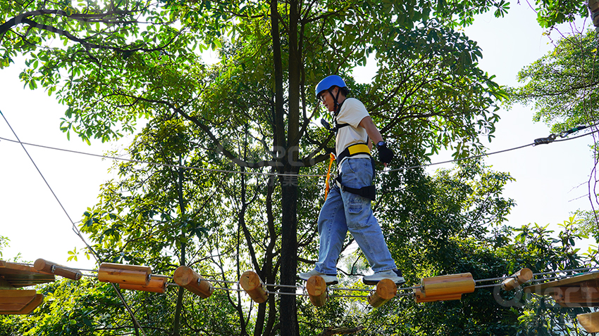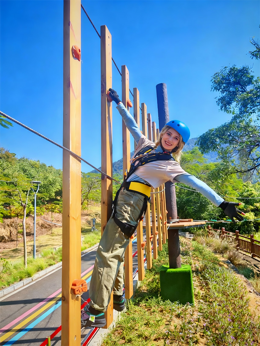 作為入門級線路,體驗線高度適中,環節設置溫和有趣。包含短距離的獨木橋、蘑菇橋和交叉秋千橋等。它旨在幫助游客,尤其是孩子們,消除恐高心理,建立自信,初步掌握平衡與協調能力。