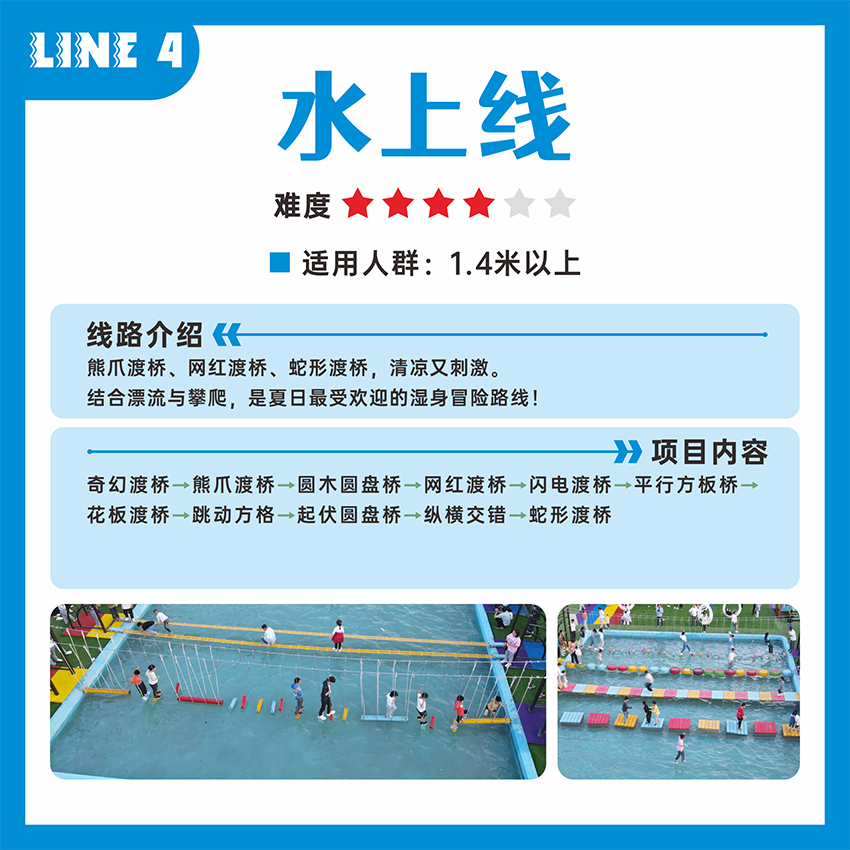 這是一條專為親子互動設計的溫情線路,可以增強了親子間的信任與默契。部分關卡需要家長與孩子共同協作才能完成,如雙人同步行走的木板橋、需要互相拉拽才能通過的繩網等。