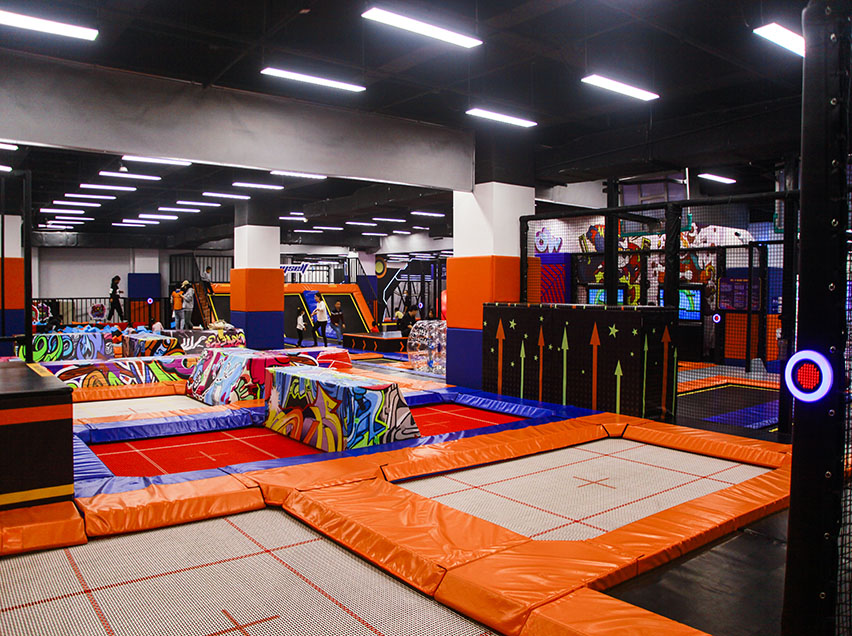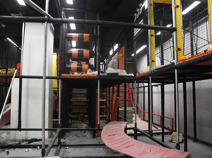 蹦床的框架部分一般采用比噴漆工藝更復雜的烤漆,噴漆僅僅是在蹦床的金屬框架上簡單打磨一陣再在上面噴漆然后自然晾干,而烤漆則需要在金屬框架上先涂幾遍底漆,待到預熱后再送入無塵衡溫烤房中進行烘烤。再就是蹦床設備經過烤漆的漆膜要比噴漆的漆膜在色澤上更加飽滿有質感,蹦床框架四邊的棱角也更光滑。