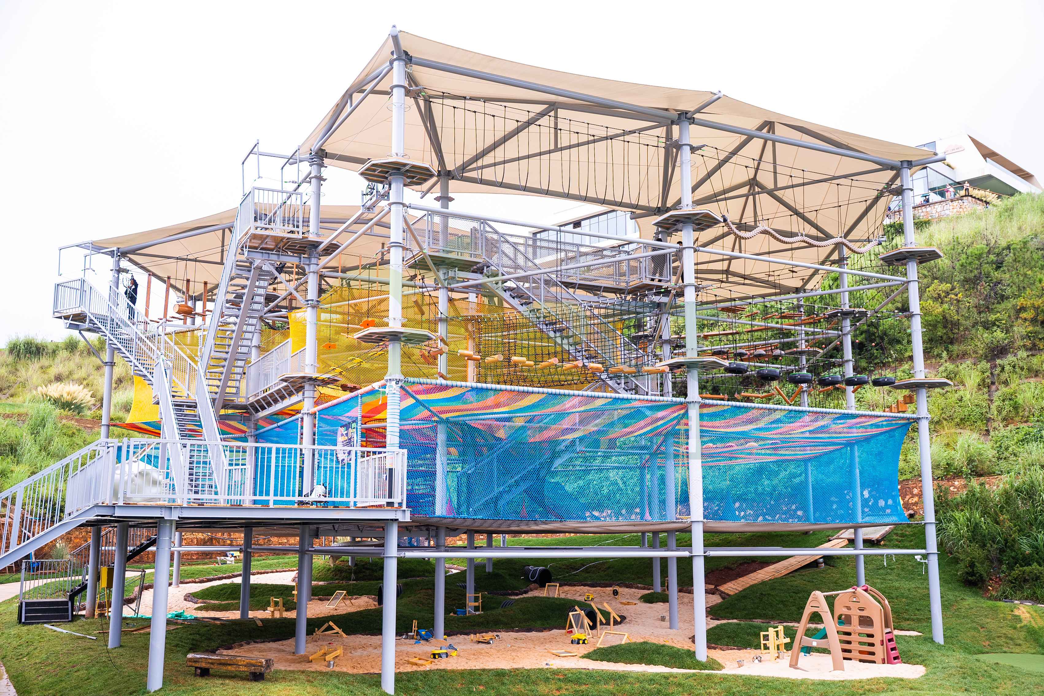 一座大型水晶塔的空中步道總長可達數百米,包含百余種趣味關卡,能夠同時容納上百名游客進行探險。更重要的是,通過科學的分層路線規劃,它能覆蓋從4歲兒童到成年人的全年齡段客群。孩子們可以在低齡區鍛煉勇氣,青少年和成人則可以挑戰更具難度的攀爬網、高空步道以及令人腎上腺素飆升的頂層速降項目。這種家庭全員可參與的特性,是其能引爆社交傳播和家庭出游市場的關鍵。