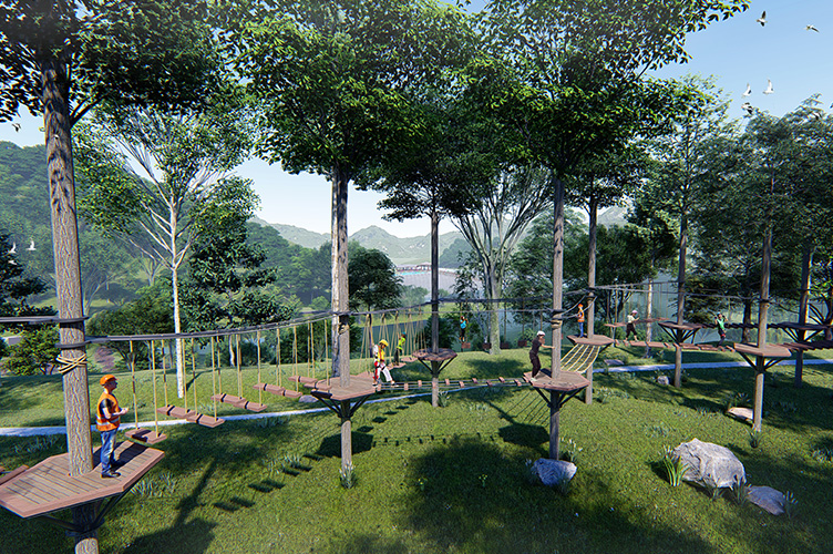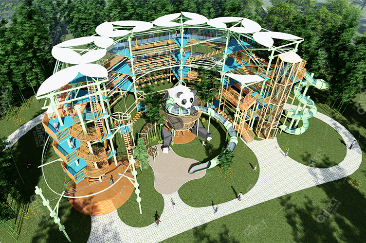 本項目適用于各種親子主題類的樂園,巧妙運用“熊貓”IP造型設計,集拓展、探險、滑道、飛索、蹦極、不銹鋼滑梯、攀巖、爬網等46種不同運動體驗的文化主題項目,結合“大灰熊”IP形象,融入相關設計元素,打造差異化的網紅IP主題性運動拓展營地綜合體。 在裝飾設計上采用竹葉和竹竿的綠色設計元素,以原生態、自然風格為基調,采用原木、繩網和不銹鋼等柔韌度好的生態材料。滿足大眾貼近自然、主題鮮明、寓教于樂的兒童素質訓練教育親子樂園的精神訴求。
