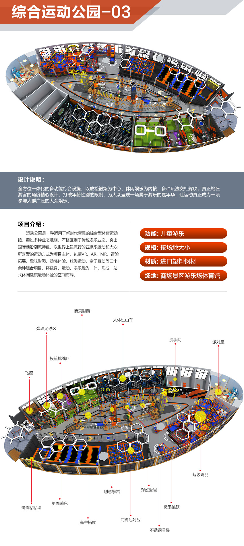 本項目適用于各種親子主題類的樂園,巧妙運用“熊貓”IP造型設計,集拓展、探險、滑道、飛索、蹦極、不銹鋼滑梯、攀巖、爬網等46種不同運動體驗的文化主題項目,結合“大灰熊”IP形象,融入相關設計元素,打造差異化的網紅IP主題性運動拓展營地綜合體。 在裝飾設計上采用竹葉和竹竿的綠色設計元素,以原生態、自然風格為基調,采用原木、繩網和不銹鋼等柔韌度好的生態材料。滿足大眾貼近自然、主題鮮明、寓教于樂的兒童素質訓練教育親子樂園的精神訴求。
