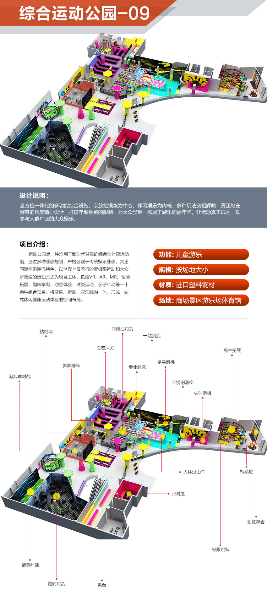 本項(xiàng)目適用于各種親子主題類的樂園,巧妙運(yùn)用“熊貓”IP造型設(shè)計(jì),集拓展、探險、滑道、飛索、蹦極、不銹鋼滑梯、攀巖、爬網(wǎng)等46種不同運(yùn)動體驗(yàn)的文化主題項(xiàng)目,結(jié)合“大灰熊”IP形象,融入相關(guān)設(shè)計(jì)元素,打造差異化的網(wǎng)紅IP主題性運(yùn)動拓展?fàn)I地綜合體。